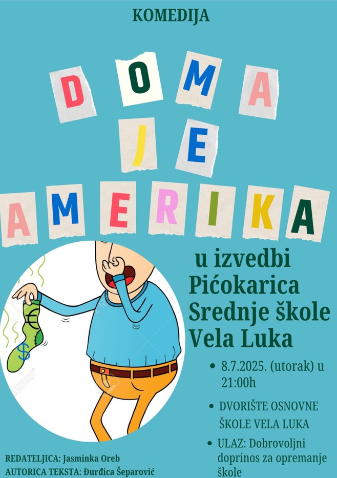 Komedija Doma je Amerika zabavna je, brza i dinamična predstava u 3 čina. Novac, škrtost i iseljavanje mladih uvijek su aktualne teme, posebice naše otočne sredine.